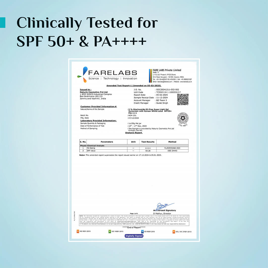The 5% Niacinamide Oil-Free Super Light Gel Sunscreen provides broad-spectrum protection with SPF 50+ PA++++, safeguarding your skin from harmful UVA, UVB rays, and blue light damage. This super light gel sunscreen is powered by UVShieldXâ„¢ Technology, Pilgrim’s proprietary complex, which works synergistically with UV filters to shield against UVA & UVB sun rays and blue light damage while deeply nourishing the skin. This oil-free sunscreen is specially designed for oily and acne-prone skin, ensuring it won’t clog pores or cause breakouts. Its dry-touch formula quickly absorbs into the skin, leaving a non-sticky, matte finish, keeping your skin comfortable all day long. 5% Niacinamide balances oil production, enhances brightness, and evens skin tone, leaving the skin matte and refreshed. Korean White Lotus acts as a natural skin conditioner, helping to enhance radiance with its powerful antioxidants. Fragrance-free, it’s also ideal for sensitive skin. For a refreshed matte finish and advanced sun protection without greasy residue and no white cast, this gel sunscreen is the perfect solution!